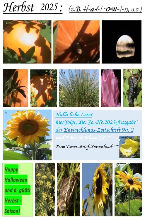 - 1. Ein paar Bilder, zu den Rubriken der Zeitschrift (oben) 2. Die "leere Seite" ist nicht wirklich ganz leer; -> zu hinterst entdecken Sie ein wenig Entwicklungs-Geschichte (Liste zu Epochen, Zeiten) (zu Erde-, Europa- und Schweiz), u.a.: -> (Download) 2.b. Ein paar Bilder zu: Entwicklung, Menschen-Leben, u.a. -> auf letzter Seite: -> (Download) 3. Einen Brief an die Leser u. Info zum Namen der Entwicklungs-Zeitschrift, u.a. -> (Download)
